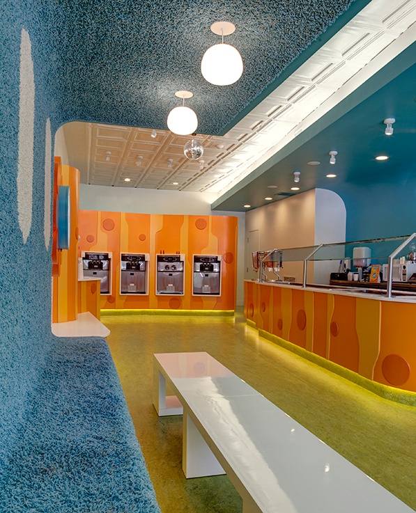 GoGo Froyo is a frozen yogurt and desert shop in Wallingford, CT’s historic downtown area. The owner was seeking a fresh, light-hearted environment to compliment their other local business, Mr. D’s Sweet Shop, another environment and branding concept designed with Pirie Associates. The design was interpreted from a 1960’s color palette and graphical vocabulary, inserted into an early 20th century existing building with traditional forms and materials. Lighting was strategically used to emphasize the curving forms and intersections between old and new. Pirie Associates also designed the logo, branding, and signage for this project.